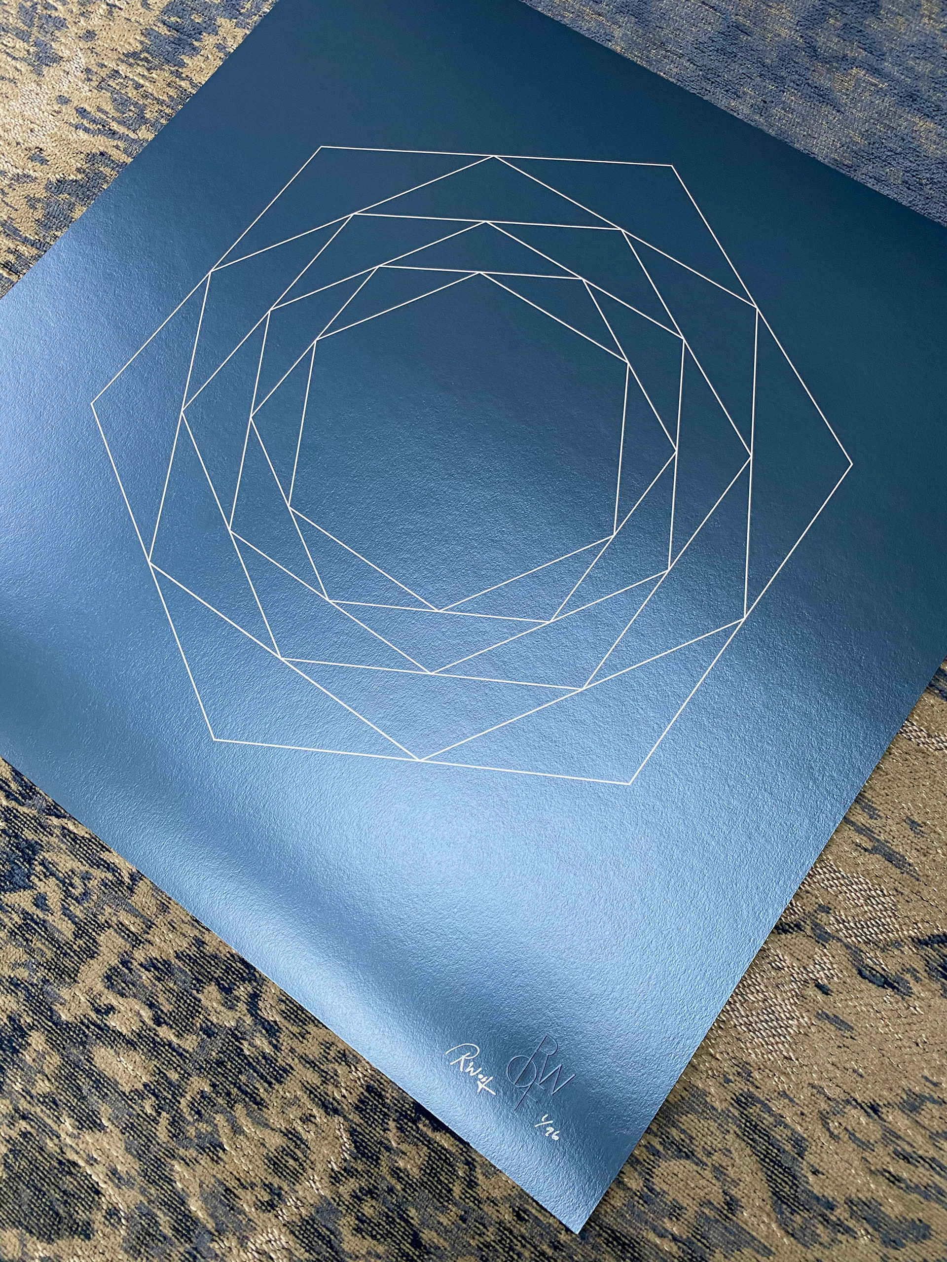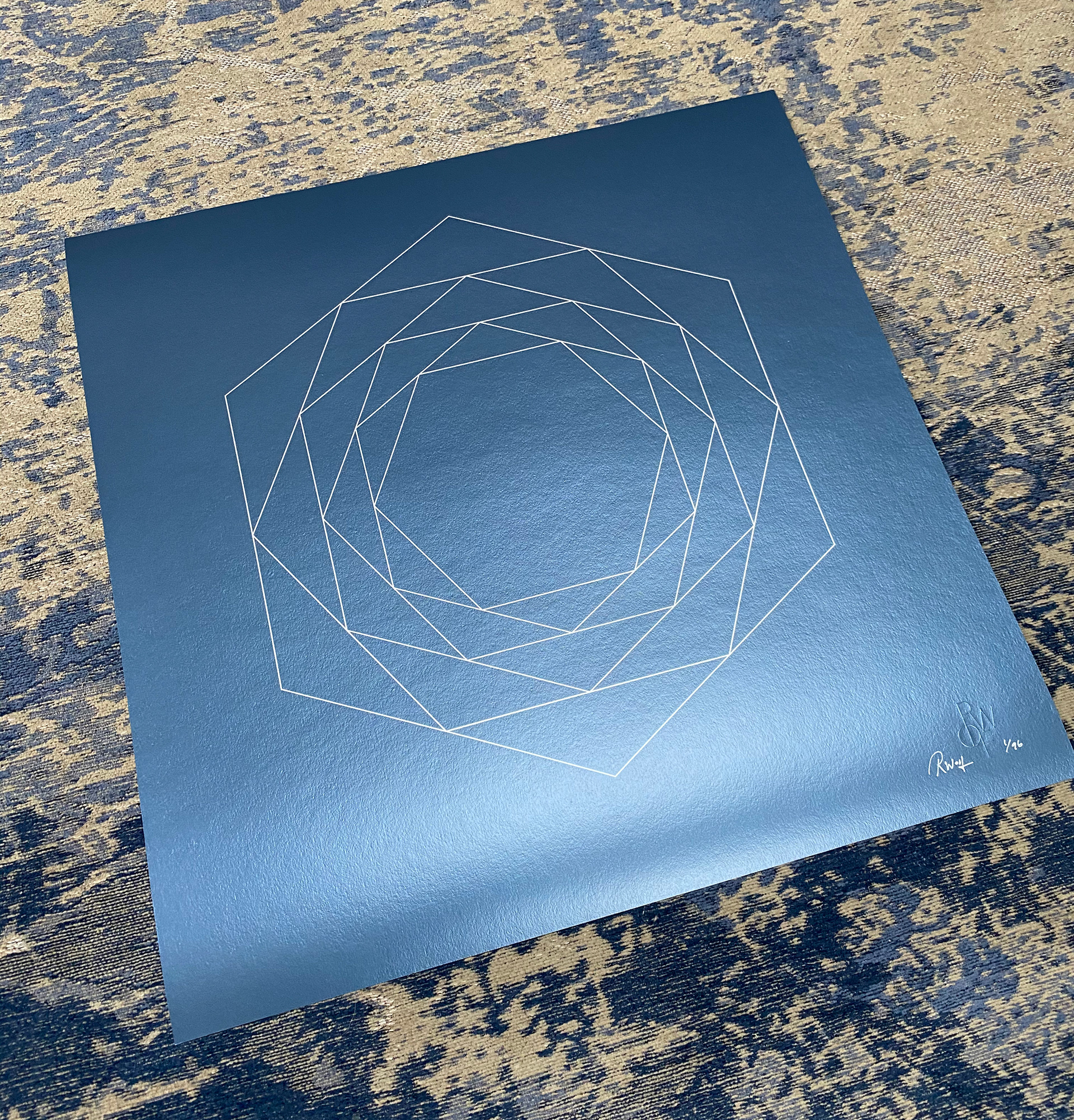 This design is from the Crystal series which shows six descending hexagons in outline to create a contemporary modern artwork. Printed on a very special natural cotton paper with a silvery-shimmering surface finish to create a unique metallic look and feel.