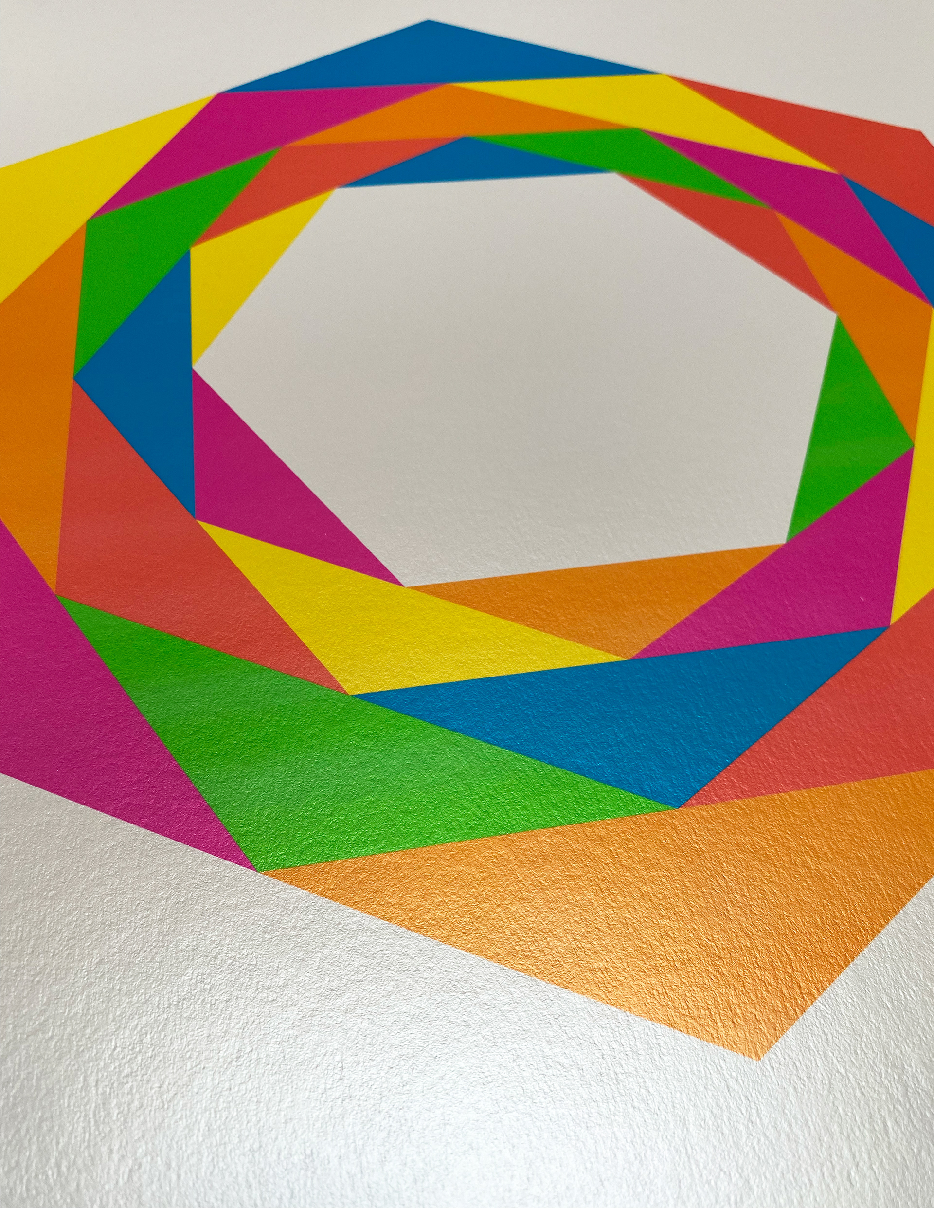Glow I is a contemporary design which deconstructs the descending hexagons to spiral towards the hexagon centre. Bright colours print on a very special metallic-finish paper to create a beautiful sheen that will 'pop'.