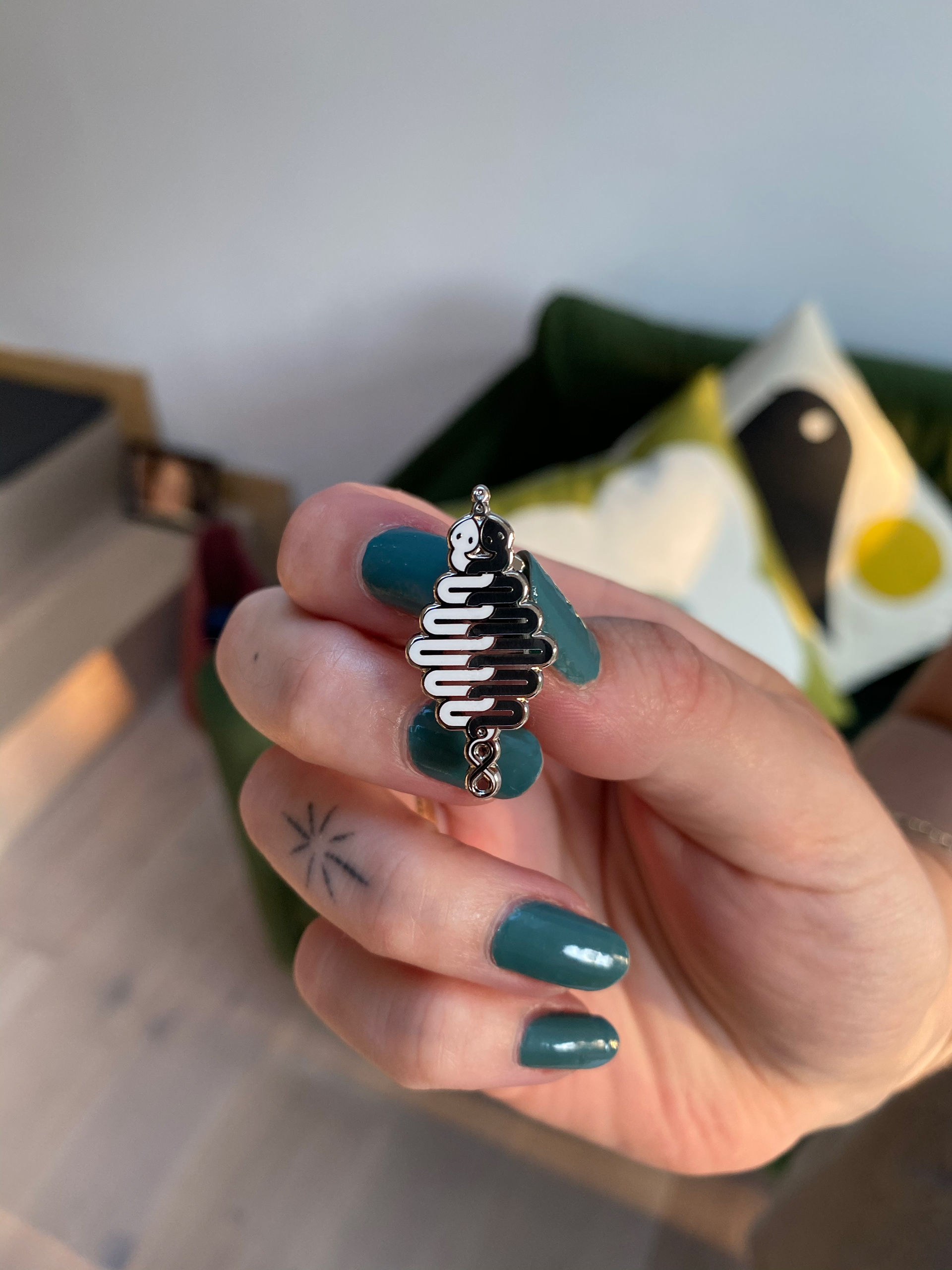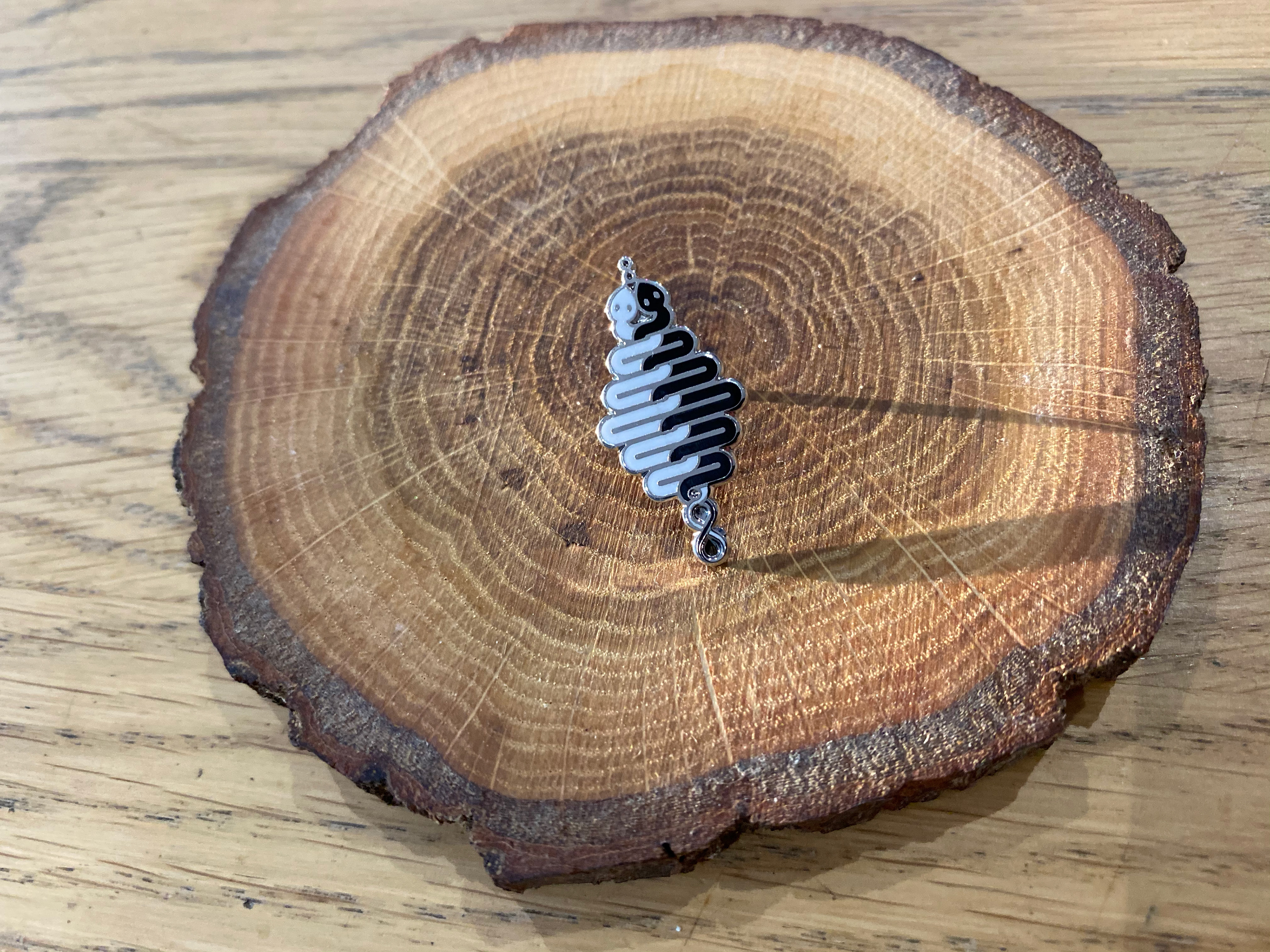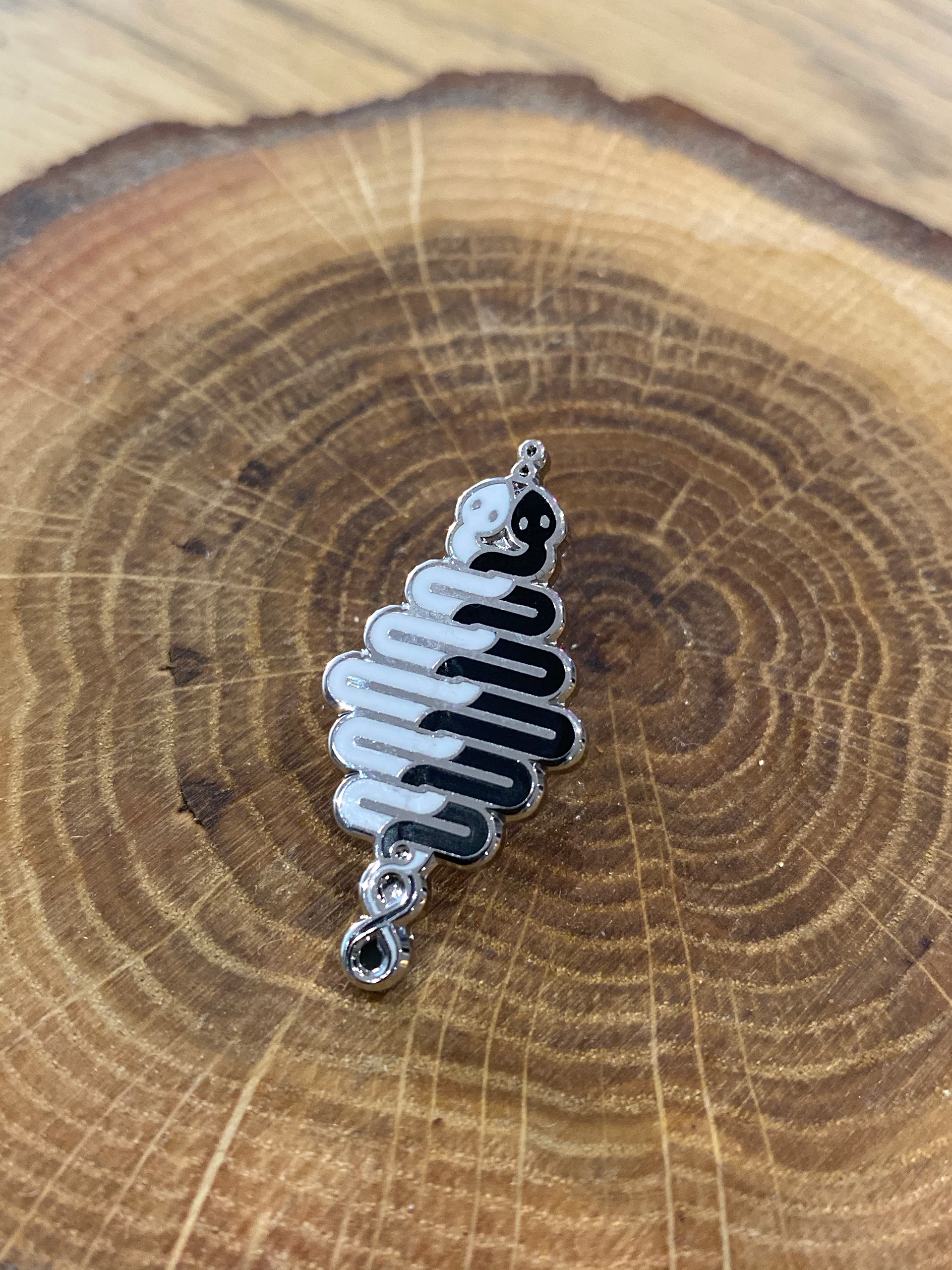 Two colour cloisonné enamel pin – black and white with metal outline – 31mm high.